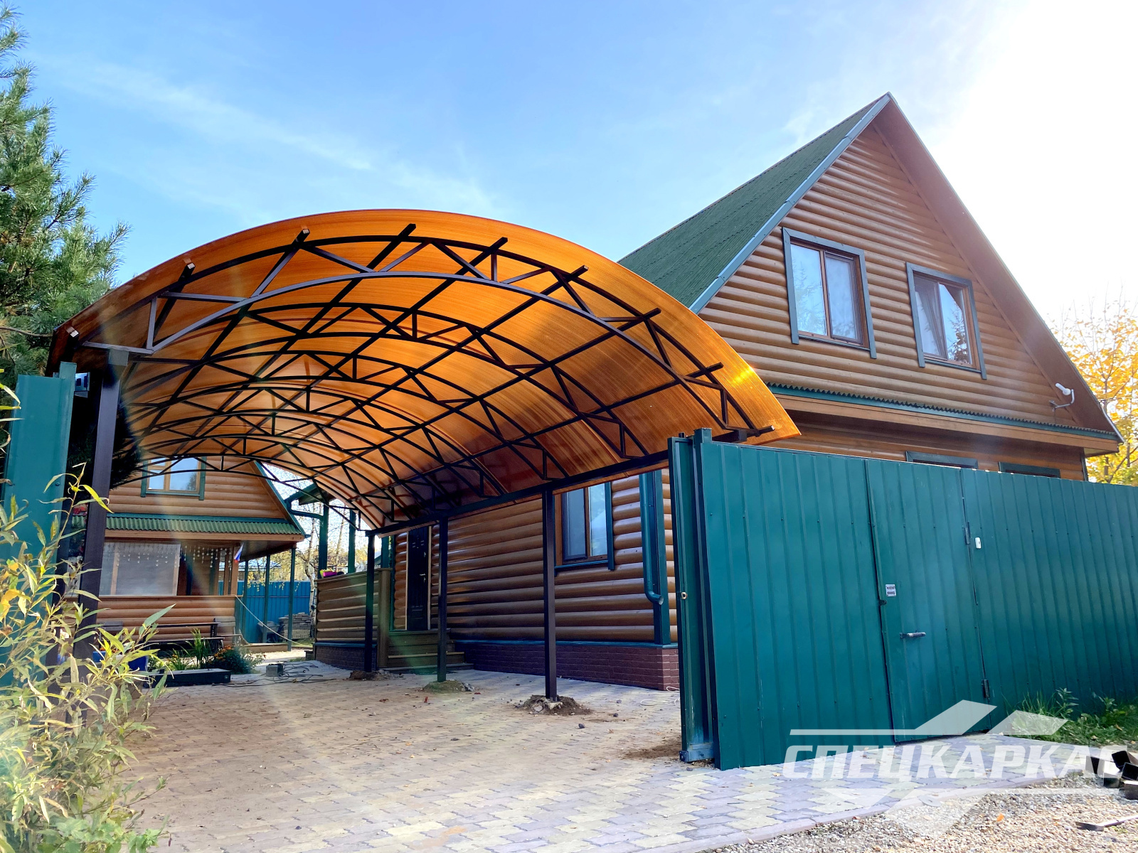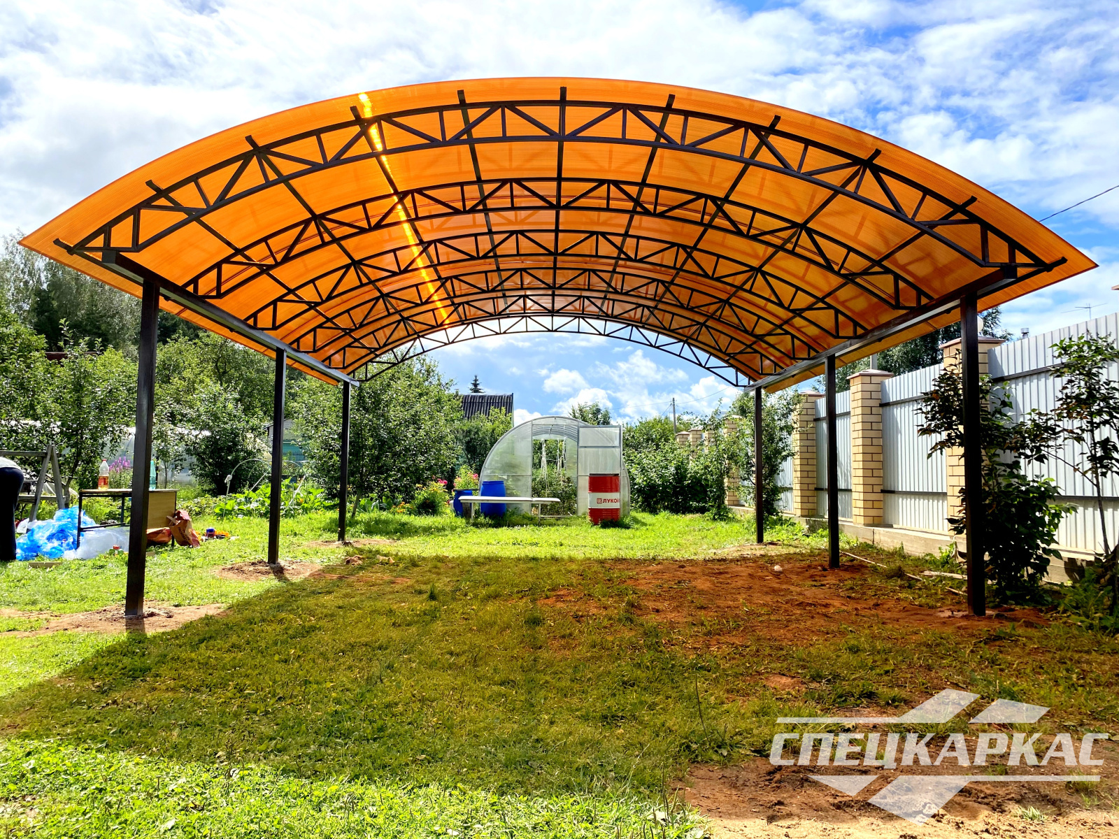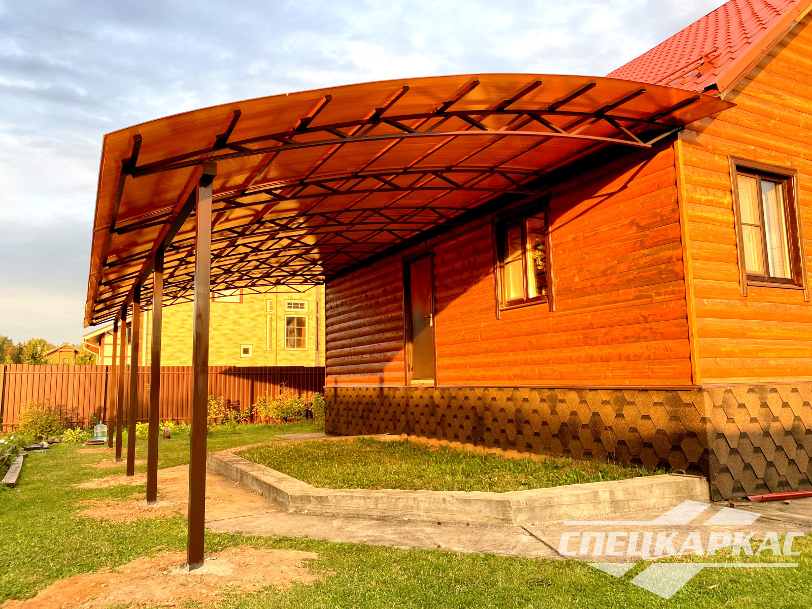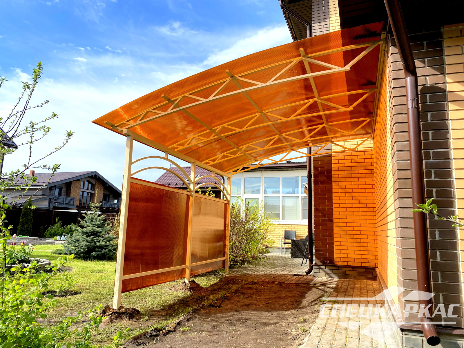 Навес из листов поликарбоната способен стать настоящей «изюминкой» частного дома и приусадебной территории. Полупрозрачные сооружения эстетичны и надежны. Их устанавливают всего за 1-2 дня, за ними легко ухаживать – достаточно чистой воды и неабразивного средства. На первый взгляд кажется, что без такой конструкции вполне можно обойтись. Но стоит купить навес из поликарбоната от компании «Спецкаркас» – и жизнь станет намного проще и комфортнее. Ваше авто больше не будет ржаветь под дождем, крыльцо останется чистым даже в снегопад, на участке появится уютная зона отдыха в кругу друзей и близких.